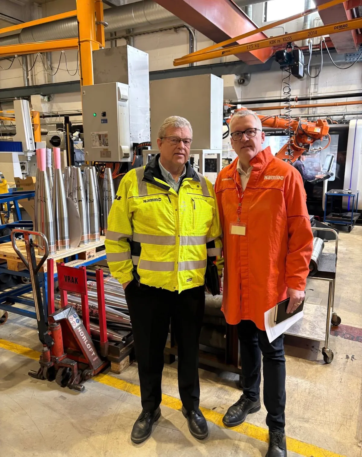 Direktør i Nammo, Morten Brandtzæg (tv), orienterte leder av Stortingets Næringskomite, Rune Støstad, om den pågående oppskaleringen av forsvarsproduksjonen og betydningen av langsiktig statlig finansiering.